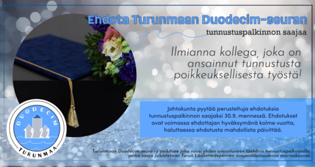 Turunmaan Duodecim-seura ry palkitsee joka vuosi yhden ansioituneen lääkärin tunnustuspalkinnolla, jonka saaja julkistetaan Turun Lääketiedepäivien avajaistilaisuudessa tiistaina 3.11.2026 klo 18.00 Sigyn-salissa. Johtokunta pyytää perusteltuja ehdotuksia tunnustuspalkinnon saajaksi 30.9.2026 mennessä osoitteeseen: toimisto@turunmaanduodecim.fi.